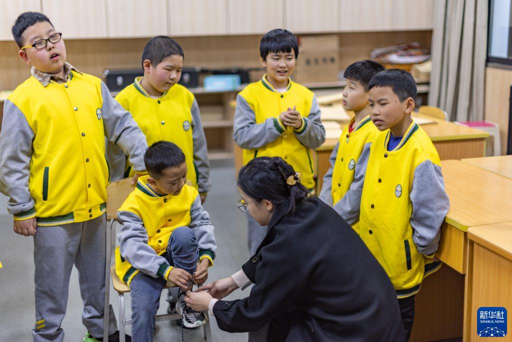 10月30日,在重慶市特殊教育中心的教室內,一名二年級的視力障礙學生在老師指導下學習繫鞋帶。