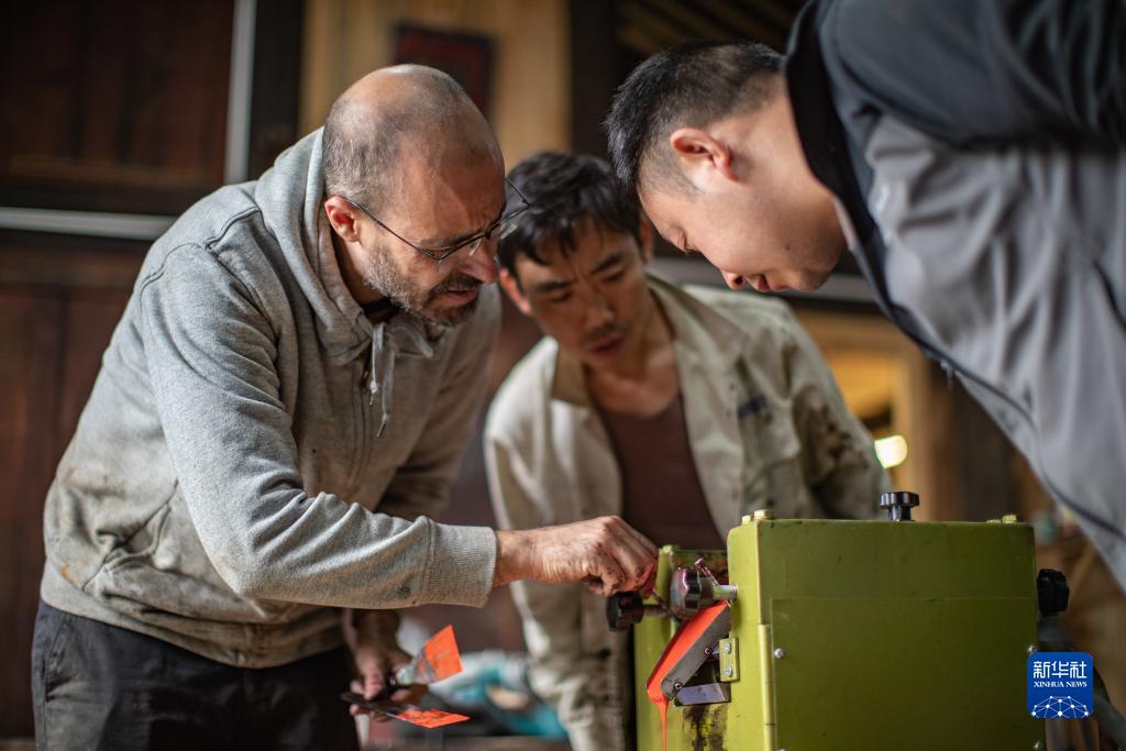 9月21日,在重慶市城口縣北屏鄉松柏村,文森(左)在工作室內指導徒弟鄭永平(中)查看紅漆研磨狀態。