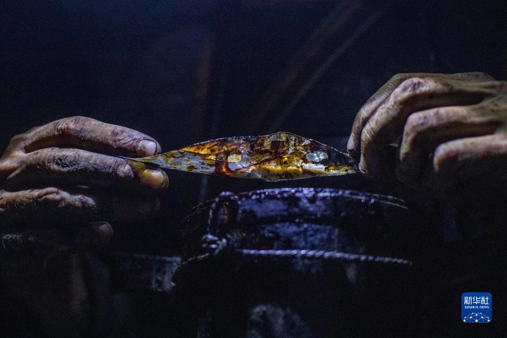 9月15日,在重慶市城口縣北屏鄉松柏村的深山中,文森準備將漆繭上的漆液收集到漆桶中。