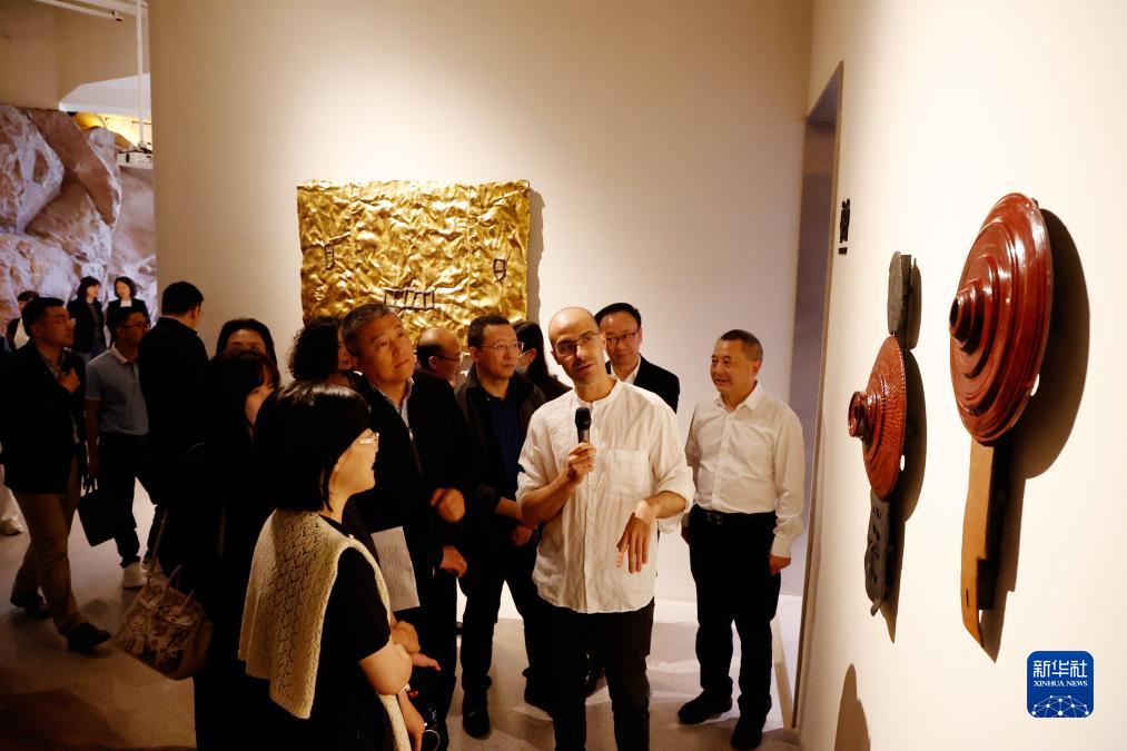 在重慶悅來美術館·岩石空間舉辦的“重慶藝術家檔案——文森·漆”主題展覽上,文森(前右)向觀眾介紹作品(4月27日攝)。