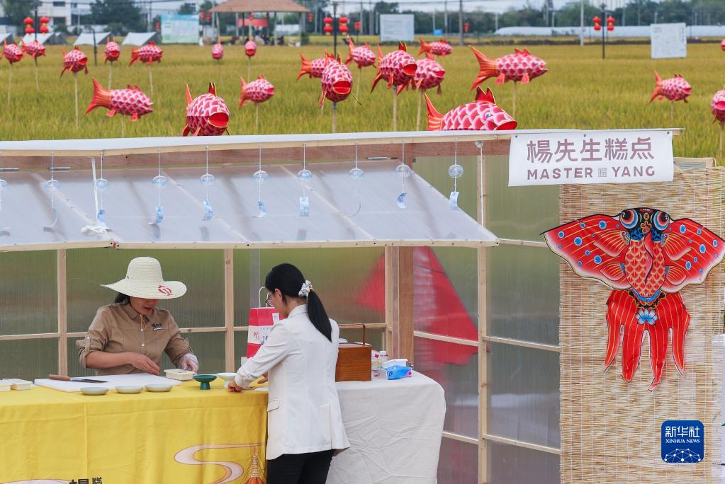 11月3日,在漁山鄉千畝省級糧食生産功能區的稻田內,鄉村集市攤位展示和銷售特色糕點。