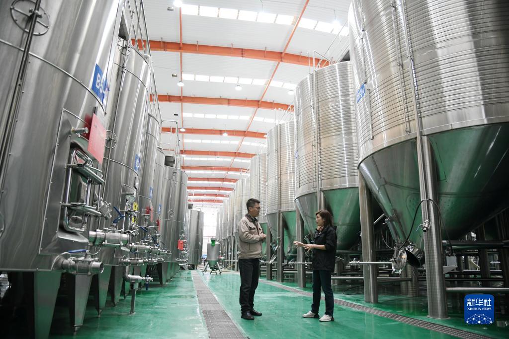 11月2日,在位於陜西省富平縣的雲集柿業富平柿園綜合項目柿酒發酵車間,雲集柿業總經理王薇(右)和生産副廠長張文裕檢查生産設備。
