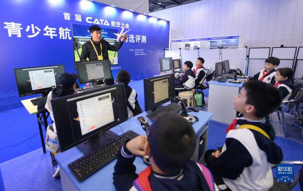 11月3日,來自北京市白家莊小學的學生在展會上參與青少年航空預備人才海選評測。