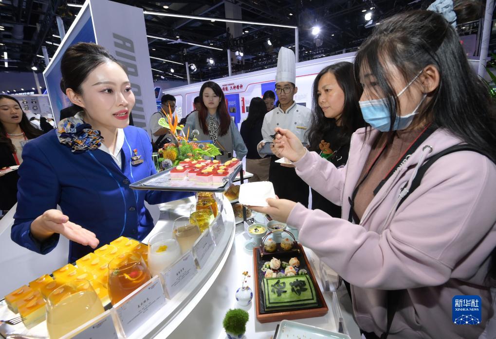 11月3日,來自中國國際航空公司的空乘人員(左)在展&邀請參觀者品嘗航食。