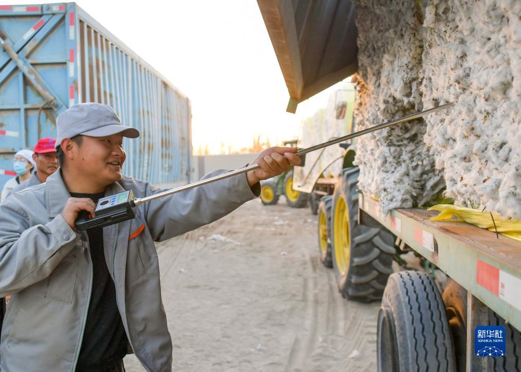 在新疆尉犁縣,棉花加工廠工作人員在檢測棉花的濕度(11月1日攝)。