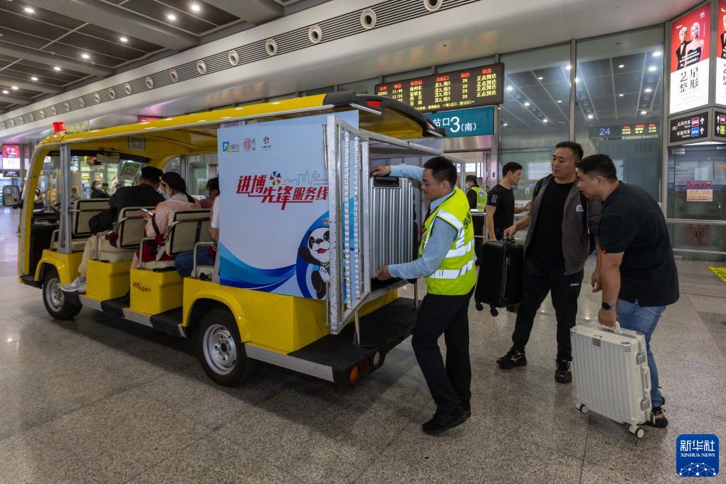 第六屆中國國際進口博覽會開幕在即,上海虹橋火車站在站廳內設立進博志願者和進博服務窗口,在售票處開闢了進博會服務專區,並開行上海虹橋站進博直通車,參展旅客和相關工作人員出示相關證件即可免費搭乘,直接前往國家會展中心(上海)。