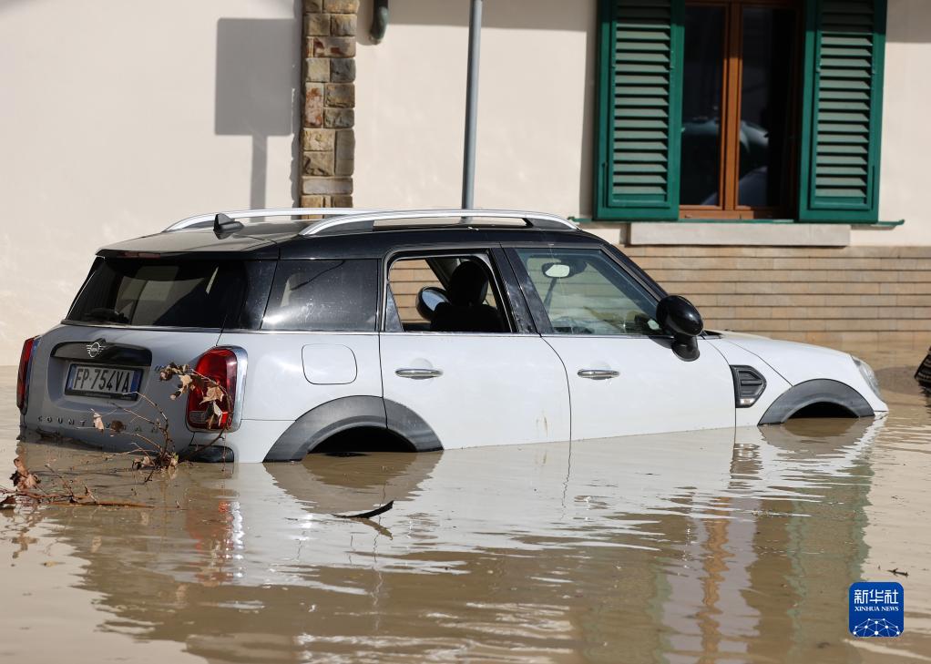 11月3日,在意大利托斯卡納大區比森齊奧營,一輛汽車浸泡在洪水中。