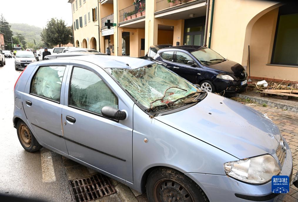 11月3日,在意大利托斯卡納大區比森齊奧營,車輛遭風暴毀壞。新華社發