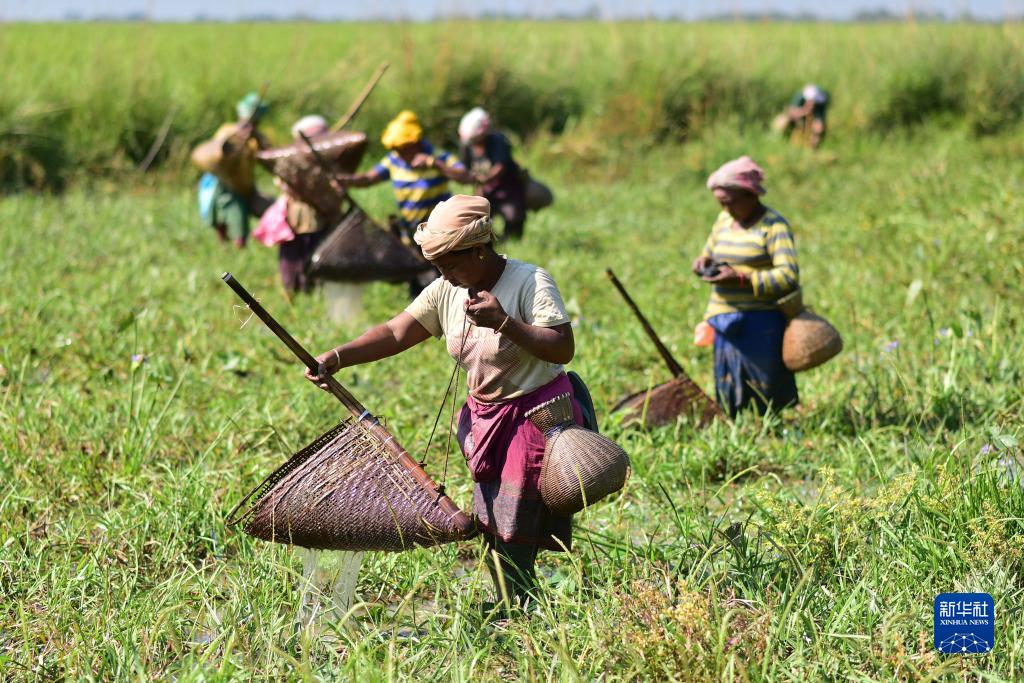 10月30日,印度阿薩姆邦納岡地區的女子在一處濕地捕魚。