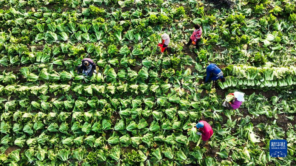 11月4日,河北省玉田縣玉田鎮農民在田間收穫白菜(無人機照片)。