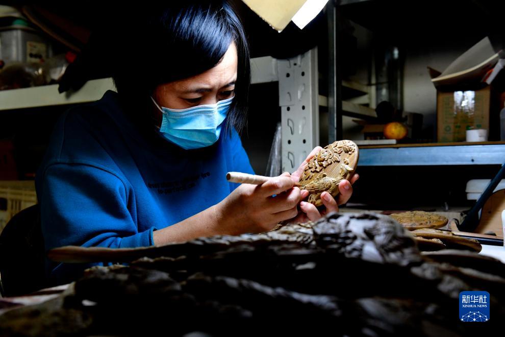 11月3日,在嘉祥縣一家木雕生産企業,工作人員在雕刻木梳。