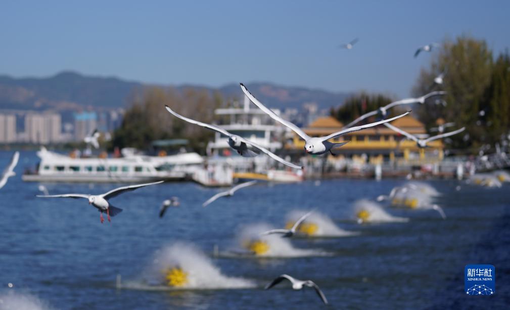 11月4日,紅嘴鷗在昆明滇池上空飛舞。