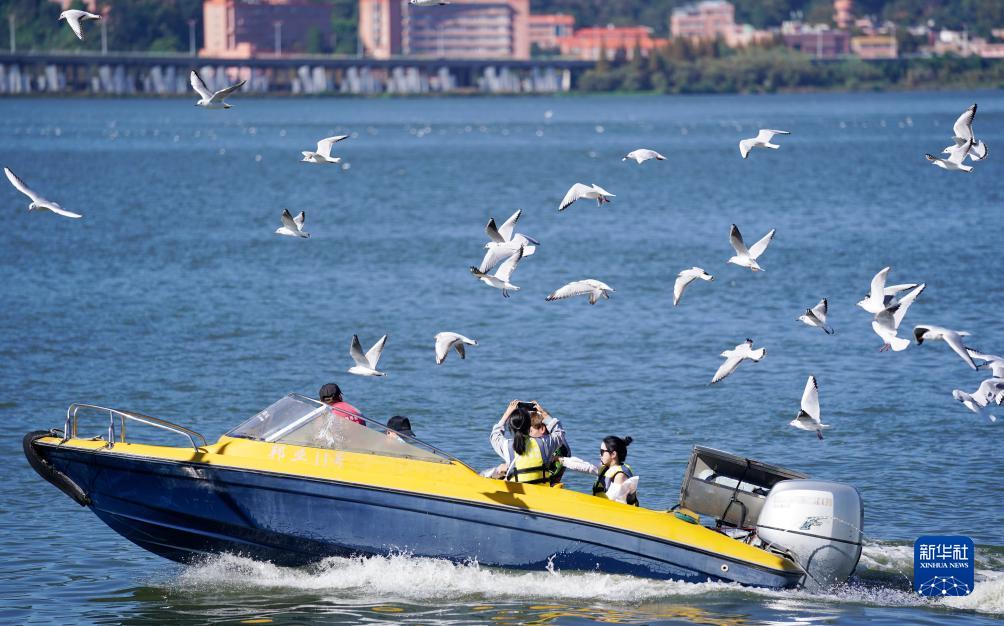 11月4日,游客在昆明滇池海埂遊船上觀賞紅嘴鷗。