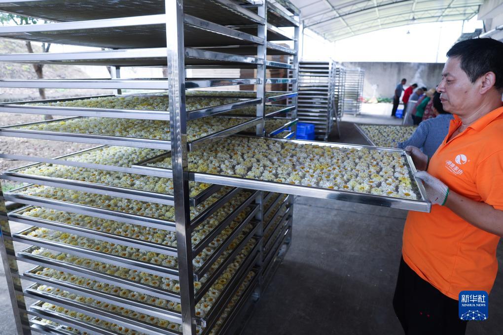11月4日,在三村村一家現代農業企業內,工作人員把分揀好的杭白菊送入車間進行進一步加工。