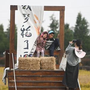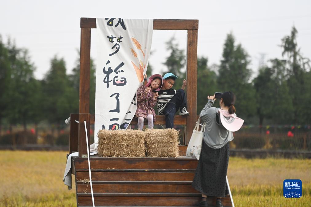 11月4日,小朋友在南潯區雙林鎮萬畝稻蝦綜合種養示範區游覽、拍照。