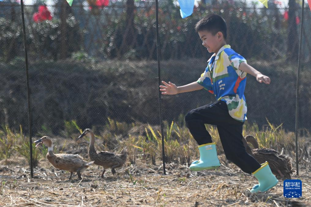 11月4日,小朋友在南潯區雙林鎮萬畝稻蝦綜合種養示範區的稻田游園會捉鴨子。