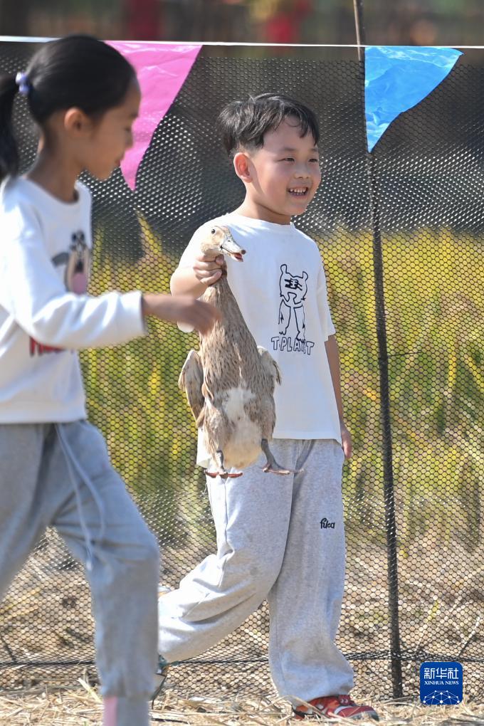 11月4日,小朋友在南潯區雙林鎮萬畝稻蝦綜合種養示範區的稻田游園會捉鴨子。