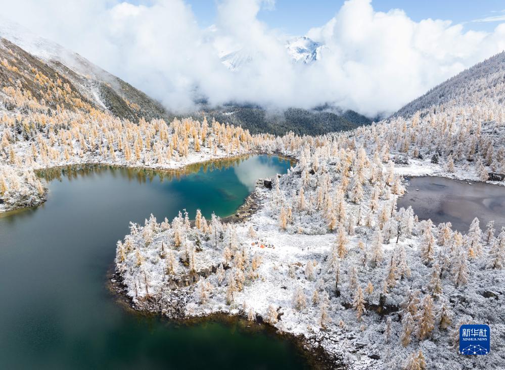 雪山、藍天白雲和黨嶺村葫蘆海、彩林構成一幅優美的畫卷(10月27日攝,無人機照片)。