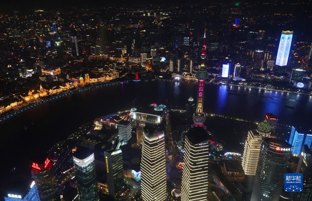 11月3日,從上海中心觀光廳俯瞰市區夜景,浦西白玉蘭廣場(右上)在樓身上亮起第六屆進博會宣傳綵燈。