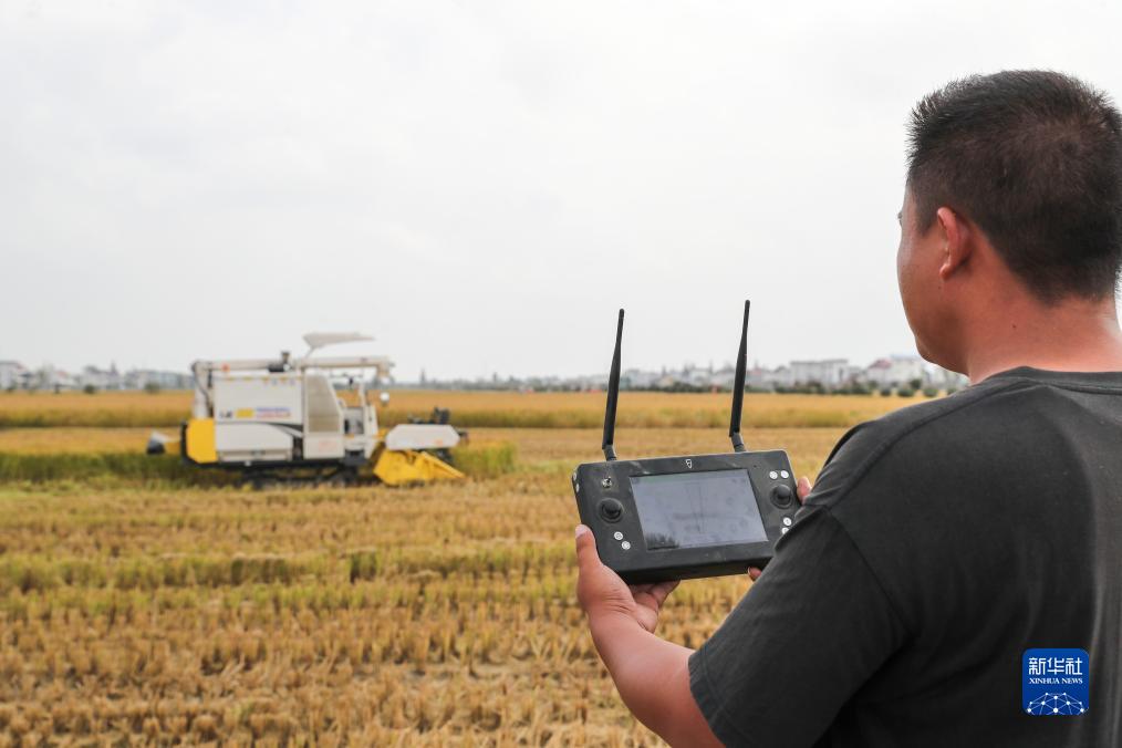 11月4日,在南通市通州區十總鎮育民村農場,技術員查看一台設置好參數的無人收割機工作情況。