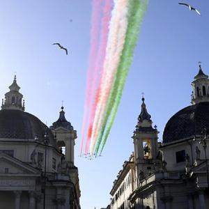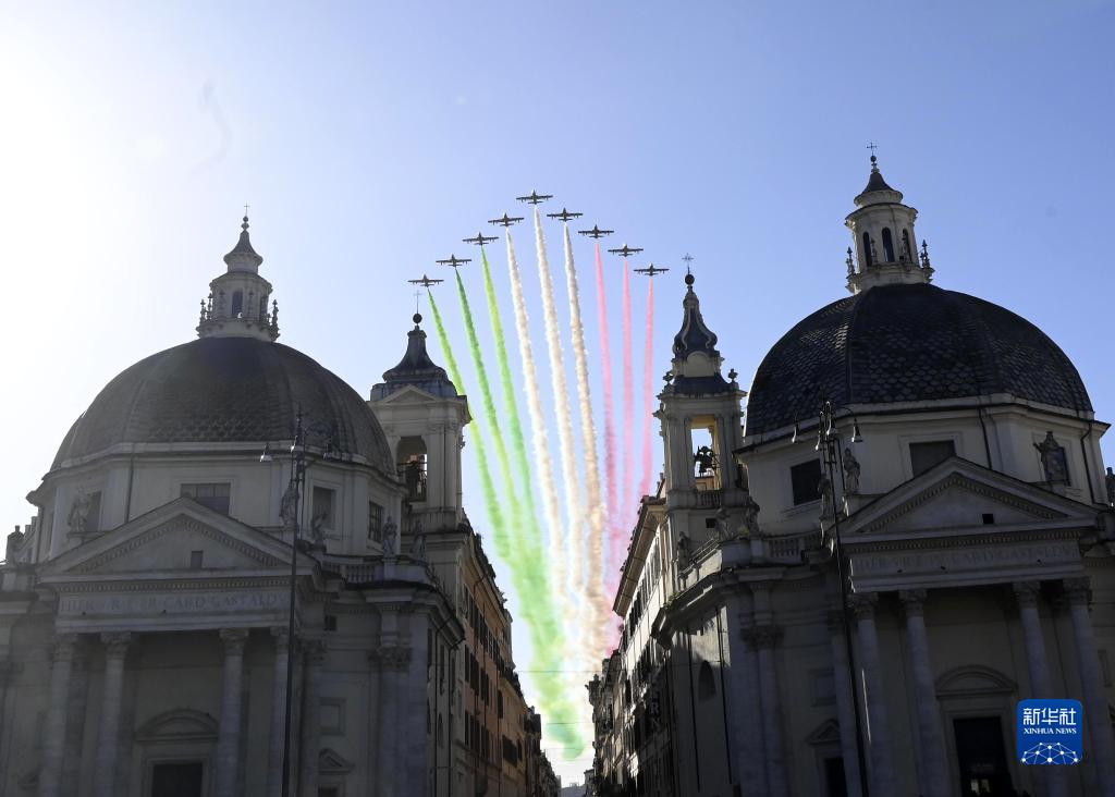 11月4日,意大利“三色箭”飛行表演隊噴出象徵國旗三色的煙霧飛過羅馬上空,慶祝國家團結日。