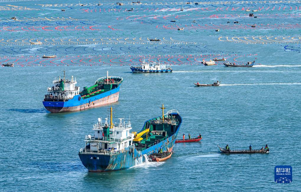 11月4日,在榮成市愛倫灣海域鮑魚養殖區,養殖戶將鮑魚裝船(無人機照片)。