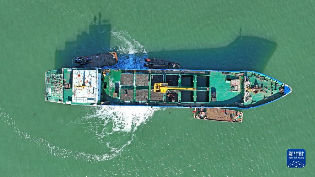 11月4日,在榮成市愛倫灣鮑魚養殖區,養殖戶將鮑魚裝船(無人機照片)。