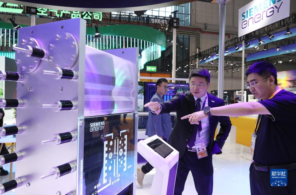 11月5日,工作人員(左)介紹第六屆進博會西門子公司展出的電解水制氫裝置模型。