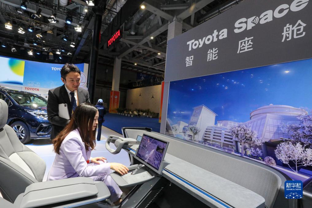11月5日,媒體記者在第六屆進博會汽車展區體驗豐田公司的智能座艙。
