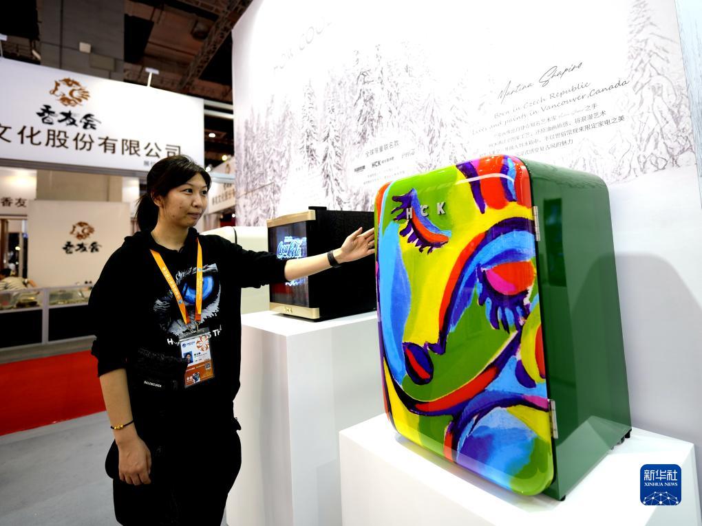 11月5日,在第六屆進博會消費品展區HCK哈士奇冰吧展&,工作人員介紹首次展示的一款復古冰箱。