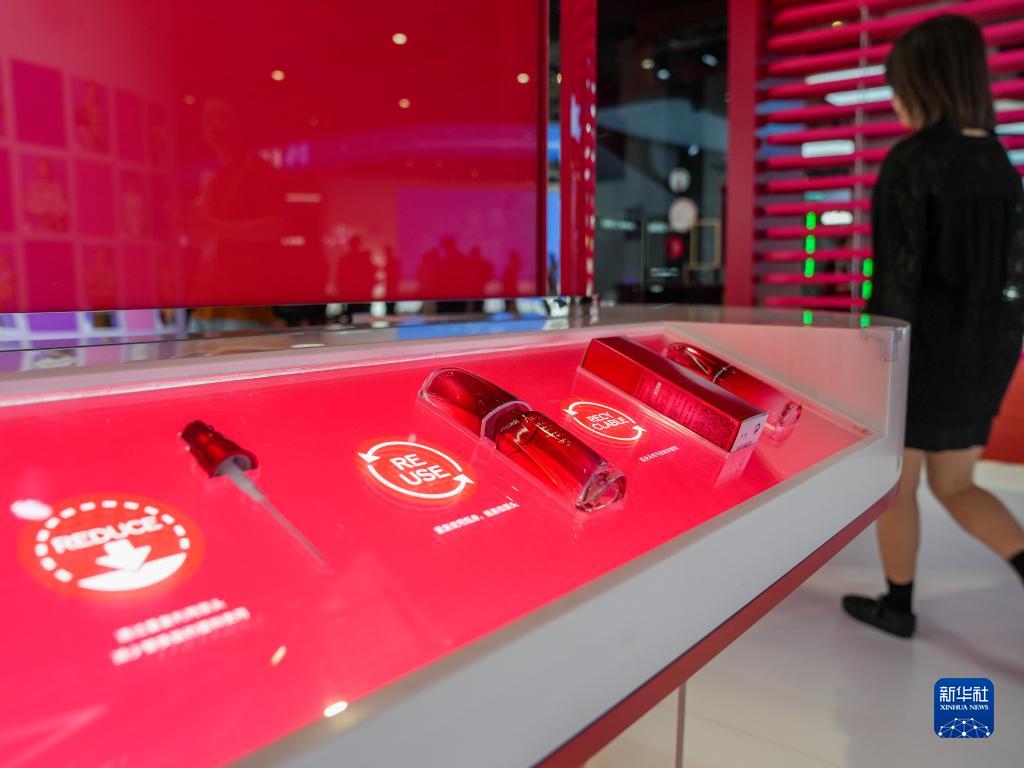 11月5日在第六屆進博會消費品展區資生堂展&拍攝的紅腰子空瓶。資生堂在進博會上首發首秀的“紅腰子空瓶再續計劃”,可讓化粧品空瓶實現100%循環使用。