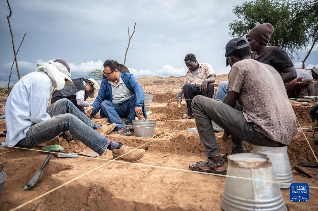 11月3日,中肯聯合考古隊隊員顧雪軍(左三)在位於肯尼亞巴林戈郡馬里加特鎮的考古現場進行發掘工作。