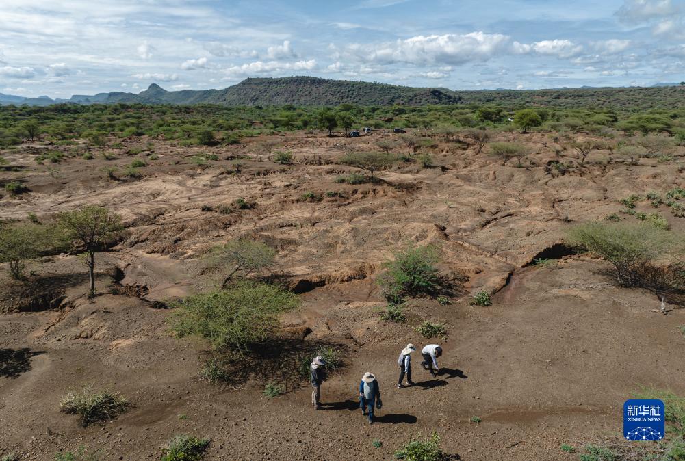 11月4日,中肯聯合考古隊隊員在位於肯尼亞巴林戈郡馬里加特鎮的考古現場周邊區域進行野外調查(無人機照片)。
