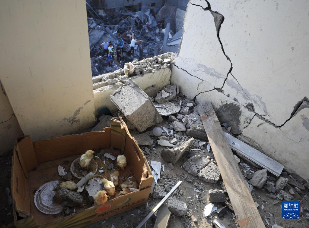 11月5日,在加沙地帶中部的代爾拜拉赫,遭以色列轟炸後的邁加齊難民營建築物被損毀。
