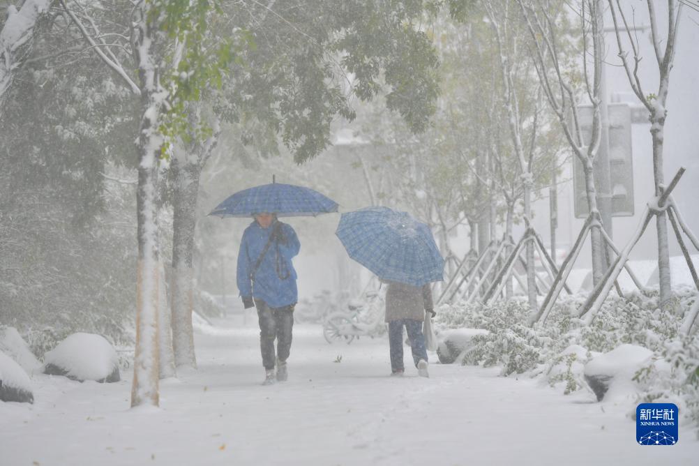 11月6日,在瀋陽市渾南區,行人在雪中行走。