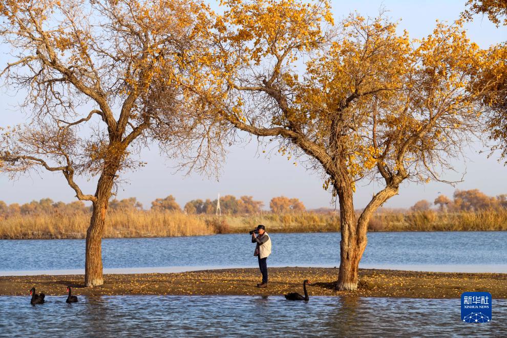 在新疆尉犁縣羅布人村寨景區,一名攝影愛好者在拍攝美景(11月3日攝)。