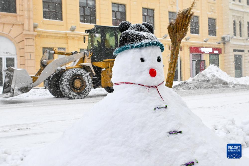 這是11月6日在哈爾濱中央大街附近拍攝的雪人,鏟雪車在一旁剷除積雪。