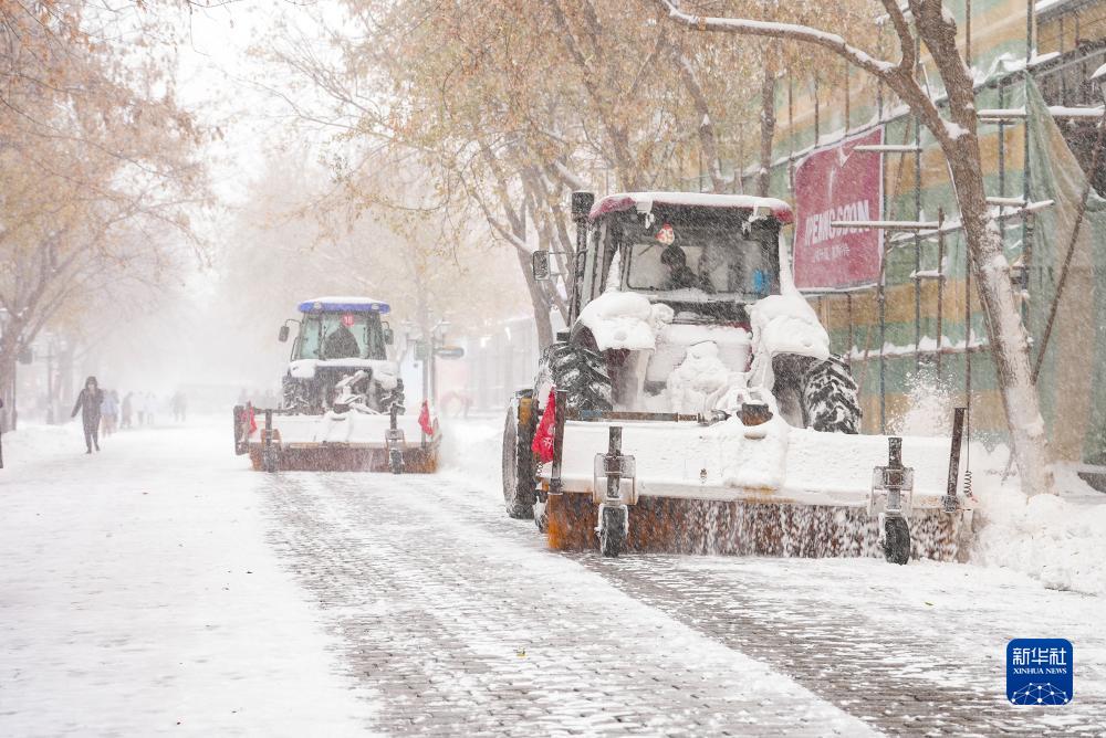 11月6日,清雪車在哈爾濱中央大街上剷除積雪。