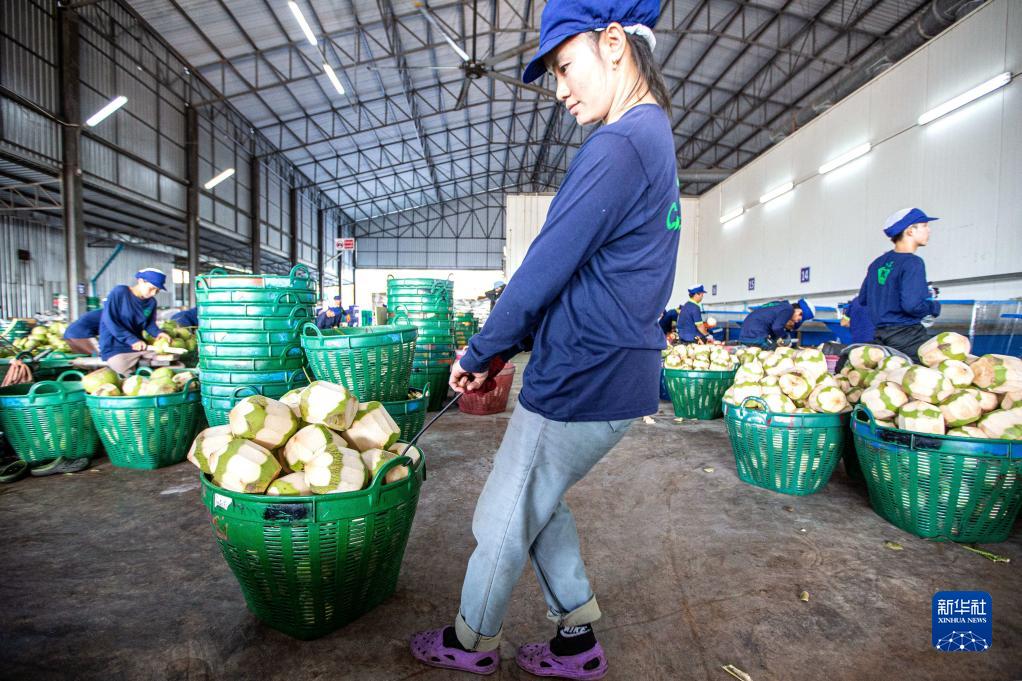 11月3日,工人在泰國叻武裏府丹嫩沙多的椰子工廠搬運椰子。