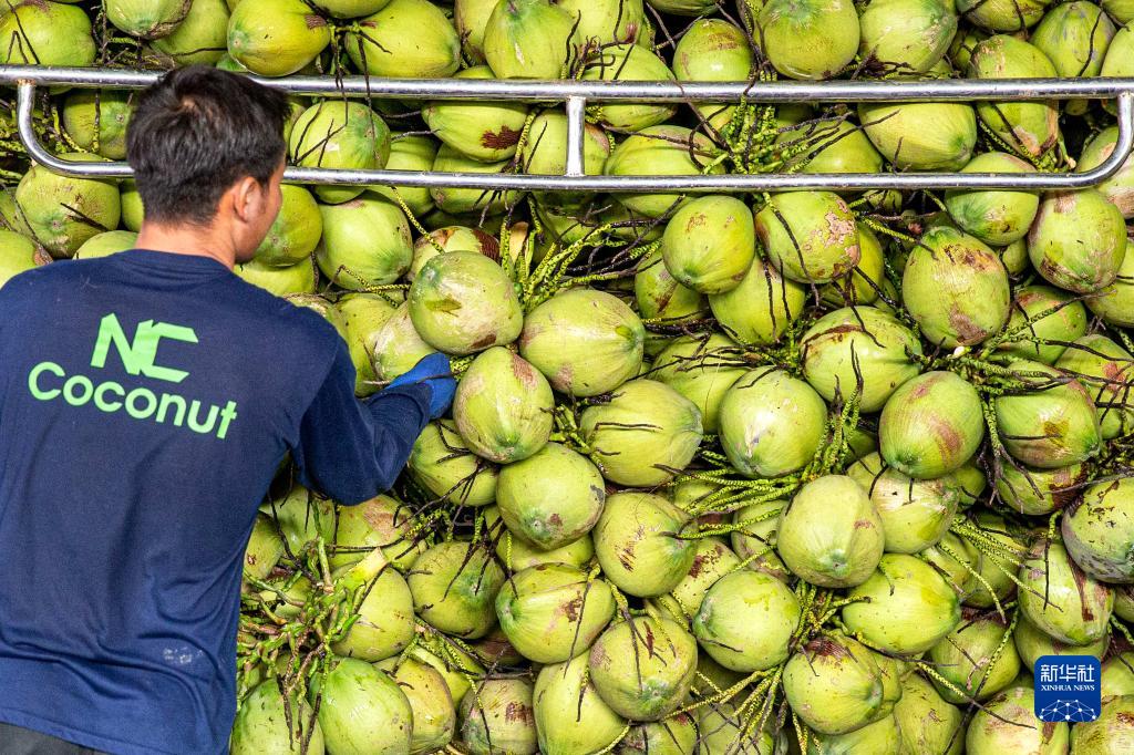 11月3日,工人在泰國叻武裏府丹嫩沙多的椰子工廠卸貨。