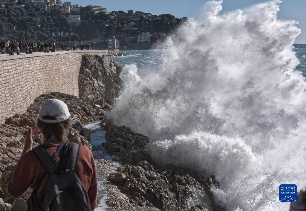 近日,受風暴天氣影響,法國尼斯海岸巨浪拍岸,吸引人們駐足觀看。