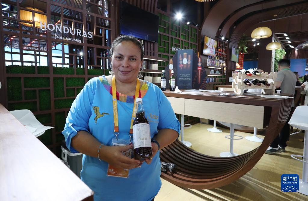 11月6日,來自洪都拉斯的卡倫·約翰娜·皮內達·加西婭手捧一款洪都拉斯特産葡萄酒站在展&前。這是她第一次來到中國上海參加進博會,她感到很高興,希望以後每年都能來,也希望能通過進博會成功找到中國合作夥伴。