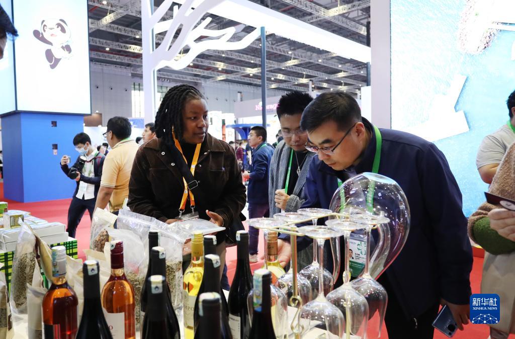 11月6日,來自坦桑尼亞的艾斯黛拉(前左)向參觀者介紹展品。今天是艾斯黛拉來中國的第二天,她&&參加進博會讓她感到很高興。艾斯黛拉説等進博會閉幕後她要在上海游覽一下,希望自己的公司能在中國找到合作夥伴。