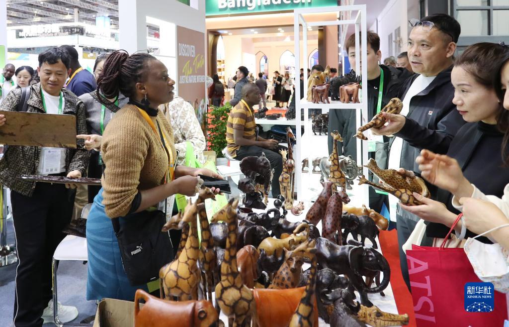 11月6日,來自津巴布韋的艾薇頓絲·察卡瓦在展&向參觀者介紹木雕展品。這是她第一次來到中國上海參加進博會,這些木雕都是她的哥哥在家裏製作的,她想通過進博會為哥哥的木雕作品找到好的銷路。