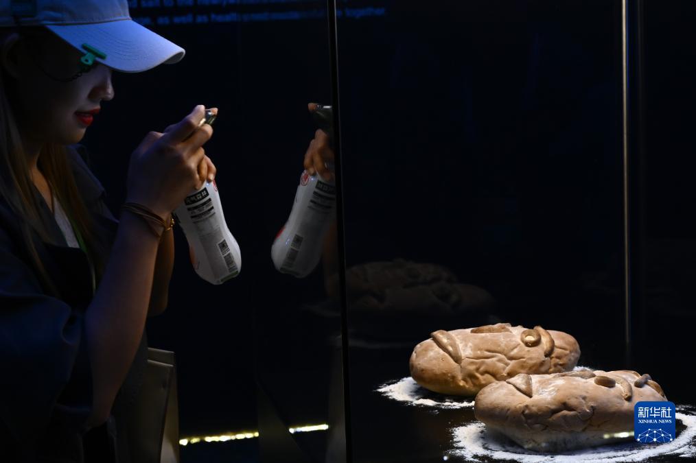 11月6日,參觀者在第六屆進博會國家展塞爾維亞展&欣賞展出的塞爾維亞麵包。