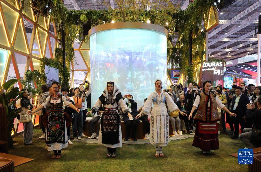 11月6日,在第六屆進博會國家展塞爾維亞展&,參觀者在觀看舞蹈。
