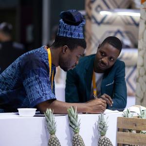 11月6日,在第六屆進博會食品及農産品展區,貝寧投資和出口促進局工作人員(左)在接待前來諮詢的客戶。