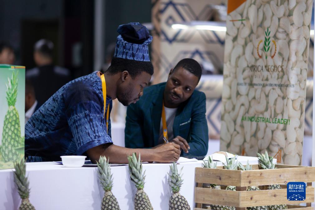 11月6日,在第六屆進博會食品及農産品展區,貝寧投資和出口促進局工作人員在交流整理客戶信息。