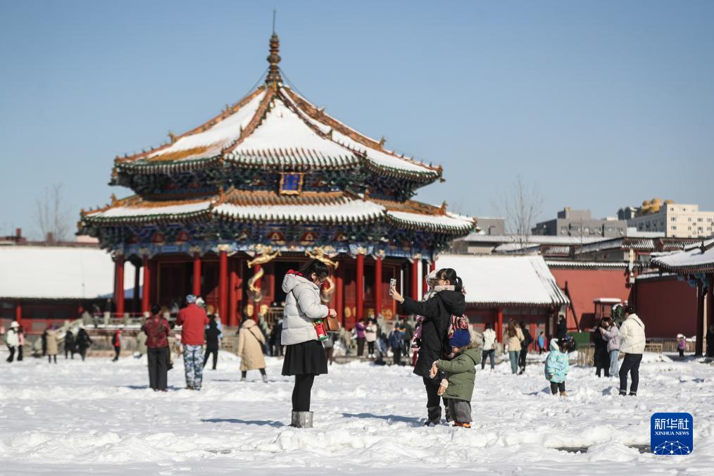 11月7日,游客在雪後的瀋陽故宮游覽拍照。