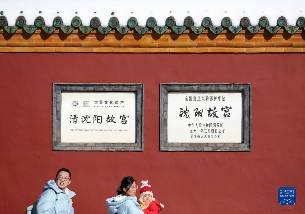 11月7日,游客走在雪後的瀋陽故宮門前。
